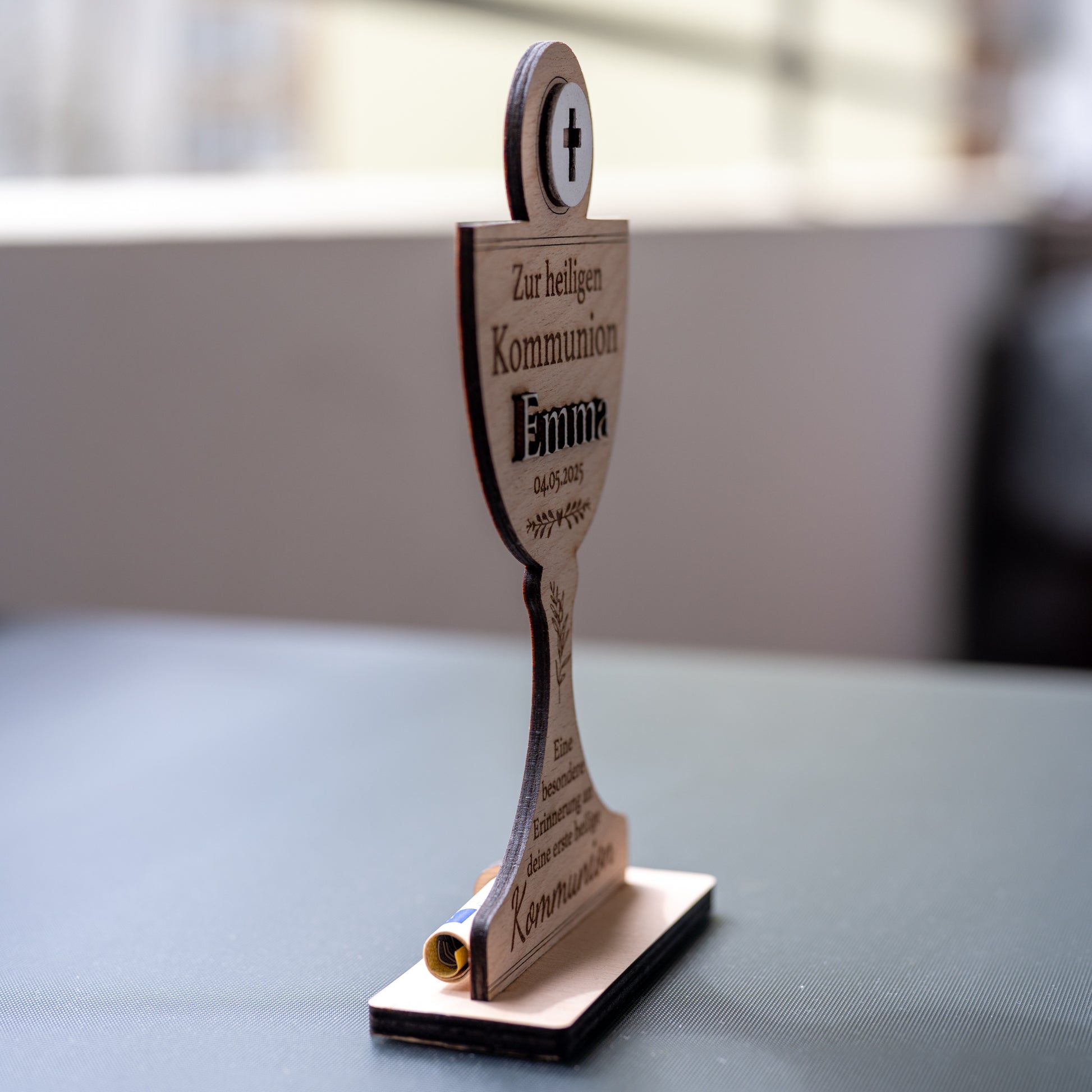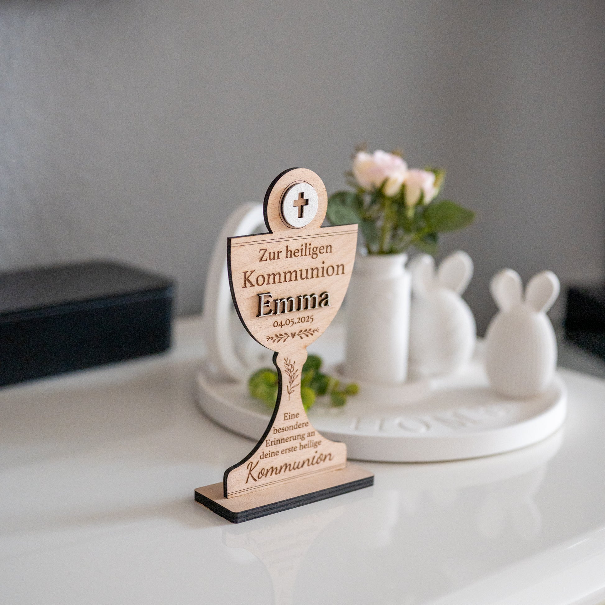 ✨ Personalisiertes Kommunion Geschenk aus Holz | Kelch mit Name & Datum | Tischdeko & Erinnerung Kommunionkind | GraviCraft Handmade